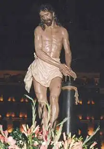 Esta excelente talla del escultor talavereño González Gil (1.912-1.991) fue adquirida por la Junta de Cofradías santanderina en 1.948. Deriva , con personalidad propia, de los prototipos de Gregorio Fernández. Entre las obras principales de su fecundo autor están pasos procesionales de Madrid, Ciudad Real, Ubeda, etc. y el Monumento a la Constitución de su Talavera natal. El antiguo "Cristo de la Columna" que desfiló con la Cofradía de la Vera Cruz y después con la Orden Tercera de San Francisco y con la Milicia Cristiana resultó destruido en la Guerra Civil (1.936).