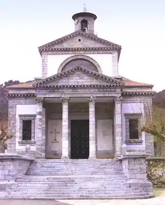 Iglesia de planta rectangular con bello pórtico clasicista y con una original torre circular independiente.