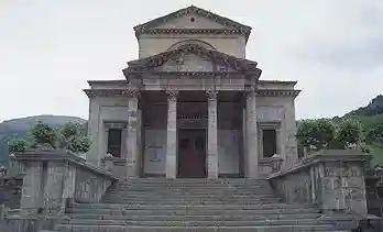 La fachada principal, que se sitúa al sur y que también obedece a modelos neoclásicos. Por delante de ella una amplia y espaciosa escalinata alcanza al pórtico, más elevado. Éste se mantiene avanzado con cuatro columnas corintias rematadas por entablamento arquitrabado y frontón triangular exento de decoración.