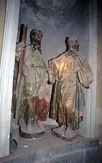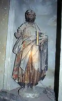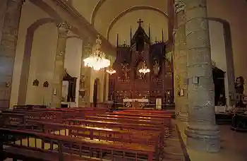 La planta rectangular, con ábside semicircular y tres naves. La nave central es más alta y tiene bóveda de cañón y está separada de las laterales, con bóvedas casi planas, por columnas corintias.