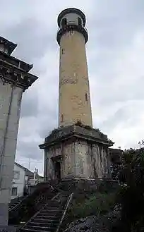 Pero de su exterior lo más original esta constituido por la torre de campanas, erigida como volumen aislado sobre un alto basamento de piedra de sillería, delante de la cabecera de la iglesia. Presenta una estructura de faro marino, con balcón volado circundante a la altura del cuerpo de campanas. Según ha transmitido la locuacidad popular, no exenta de gracejo y exageración, el indiano, enriquecido por su matrimonio en México, pretendía que la torre fuese tan alta que se pudiese ver desde allí el mar.